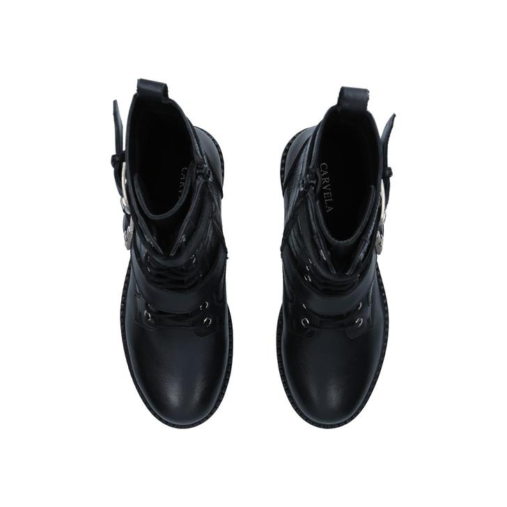 Crafted in black leather with croc-embossed detail, Carvela's Today boot ticks all the style must-haves. The fully laced front is accented by buckled straps with an inside zip fastening. The lug outsole incorporates a sturdy 45mm rise for a chunky silhouette that adds directional glam to all your go-to looks.