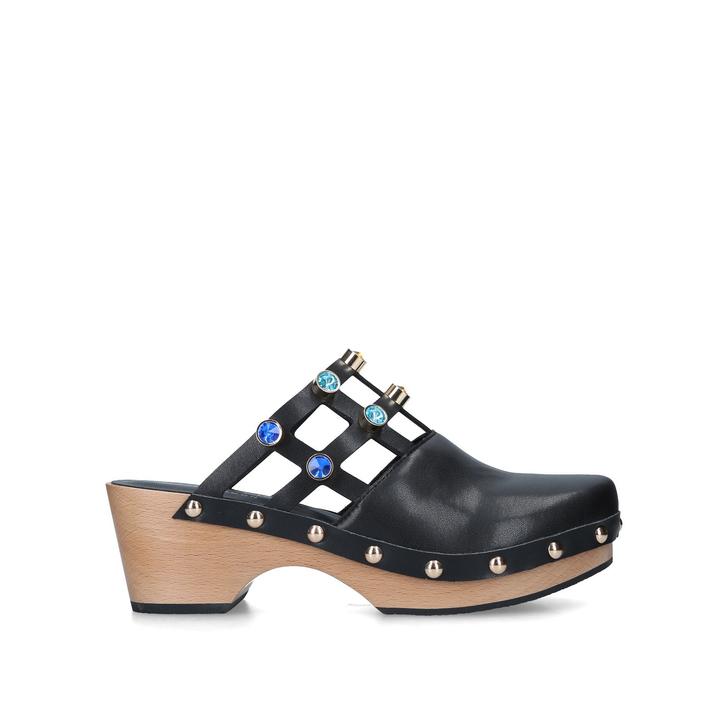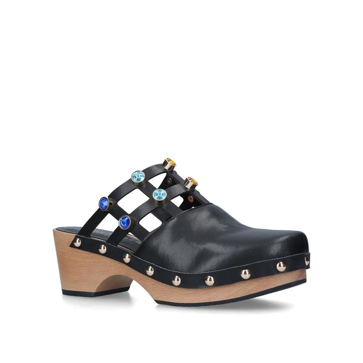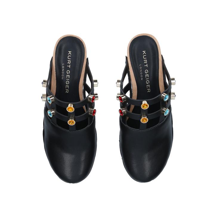 Make a confident statement this season in Kurt Geiger London's fresh spin on the clog. Oona Crystal Clogs is designed with a leather black upper dotted with crystal rainbow studs, and a run of polished gold-tone studs trimming the wood tone platform.