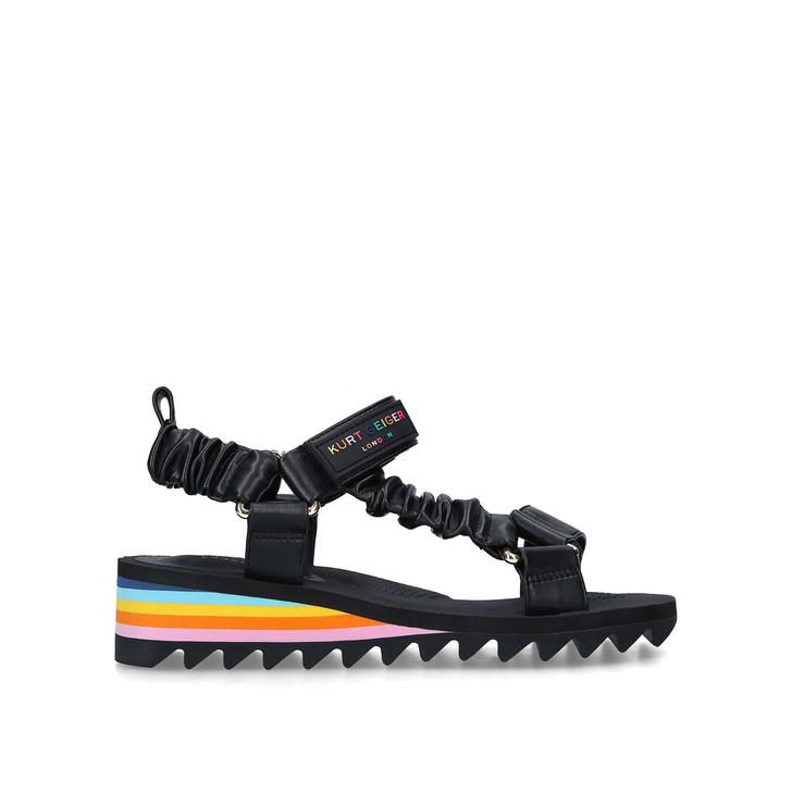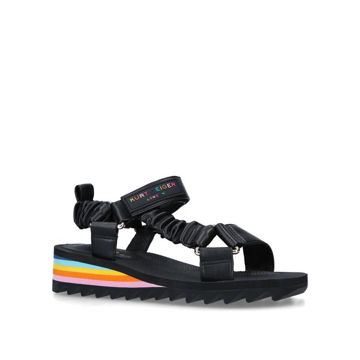 Brimming with new-season energy, the Orion sandal from Kurt Geiger London is guaranteed to draw attention. The upper straps are delivered in black with a pop of rainbow at the sole adding extra interest. The uppers are finished featuring colourful bead work and Kurt Geiger's the 'Be Kind' message. The platform sole boosts your look by 40mm without compromising on comfort.