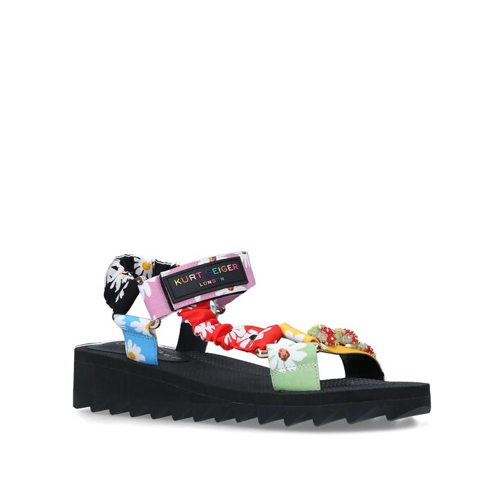 Brimming with new-season energy, the Orion sandal from Kurt Geiger London is guaranteed to draw attention. The upper straps are delivered in a mix of brightly coloured floral prints, the finishing touch is found in the floral embellishment adorning the front strap. The platform sole boosts your look by 40mm without compromising on comfort, features rainbow hued Kurt Geiger branding to the ankle strap.