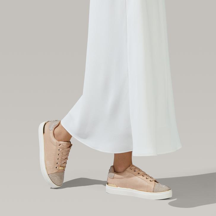 Work a little mixed-material magic into your sportive collection with Miss KG's Kingy low-top. Turned out in a blend of gleaming pink croc, mirrored metallics and textured contrasts at the counter and toe, this lace-up trainer is topped with gold-tone eyelets and set on a pumped-up outsole in white for support in every step.